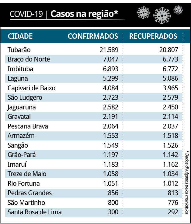 Nessa sexta-feira, também foram registradas mais quatro mortes, em Tubarão (homem de 51 anos), Braço do Norte (homem de 88 anos), Laguna (mulher de 27) e Jaguaruna (homem de 49). Ao todo, desde o início da pandemia, os óbitos registrados nos municípios foram: Tubarão (394), Laguna (130), Imbituba (101), Braço do Norte (90), Capivari de Baixo (66), Gravatal (52), Jaguaruna (51), São Ludgero (32), Armazém (29), Pedras Grandes (22), Pescaria Brava (21), Imaruí (20), São Martinho (15), Sangão (13), Rio Fortuna (11), Grão-Pará (10), Treze de Maio (10) e Santa Rosa de Lima (6).