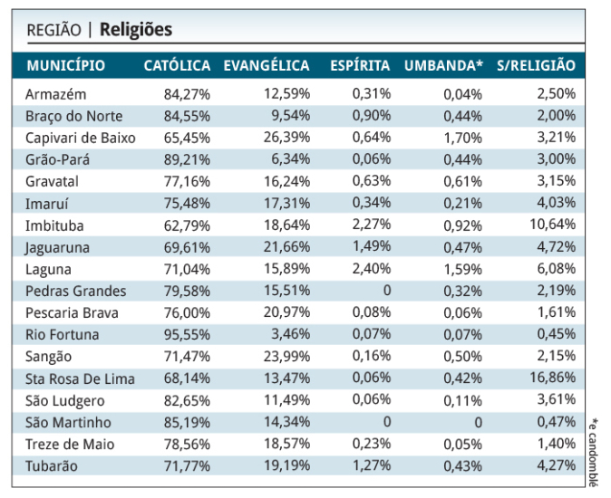 Outras crenças também foram registradas, ainda que com menor representatividade. Imbituba apresentou o maior percentual de espíritas na região, com 2,27% da população. Já em relação às religiões de matriz africana, como umbanda e candomblé, Laguna se destacou com 1,59% dos moradores identificados com essas tradições.