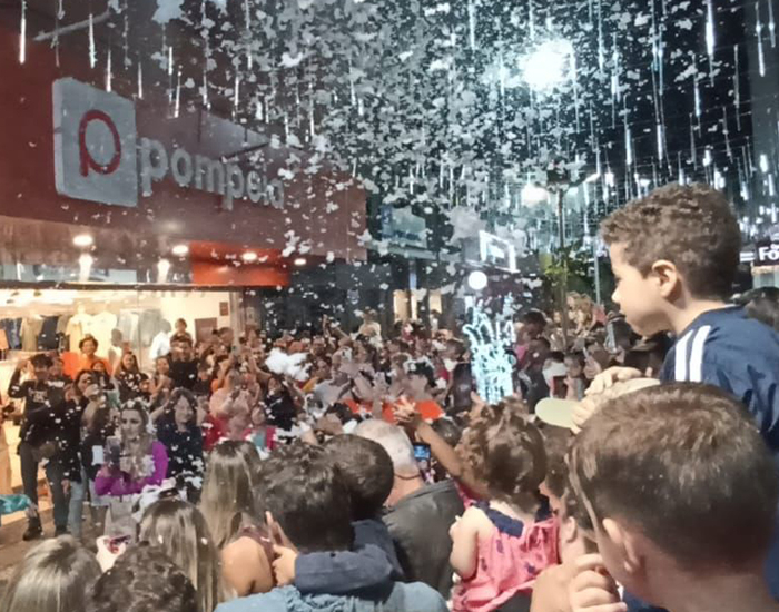 O Calçadão ficou lotado de famílias em busca dos primeiros flocos. E quem não pôde assistir de perto ainda tem até o Natal. O espetáculo ocorrerá todas as noites, inclusive aos sábados, das 20h às 20h15.