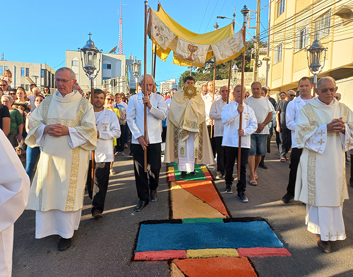 “A festa de Corpus Christi surge a partir do milagre eucarístico de Bozena e começa-se então a procissão de Corpus Christi naquele local. Então, em 1264, com o Papa Urbano IV, foi publicada uma bula chamada ‘Transiturus de hoc mundo’, em que se nota a instituição desse dia de Corpus Christi, para que toda a igreja celebrasse, de fato, enfeitando as ruas com o Corpo de Cristo, levando em procissão aquele que é o centro da nossa fé, o nosso Deus, aquele que está no meio de nós, no corpo, na espécie do Corpo e Sangue de Cristo, nas espécies do pão e do vinho”, explica o vigário paroquial da Catedral Diocesana, padre Matheus Scremin.