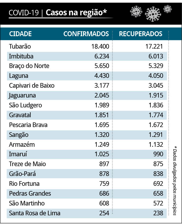 Os municípios onde mais pessoas morreram pelo coronavírus desde a última terça-feira foram Tubarão, com 16 óbitos em uma semana, Imbituba e Laguna, ambas com 13 mortes neste período.