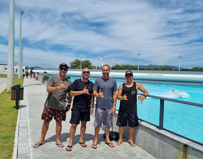 Amigos de infância e acostumados a pegar ondas juntos desde então, principalmente na praia de Itapirubá, Alexandre Furlaneto Fernandes, 54, e Murilo Teixeira de Souza, 50, de Tubarão, não poderiam deixar de ter mais esta experiência de surfe juntos e foram ontem conhecer a piscina de ondas – já amplamente falada animadamente por vários amigos também surfistas.