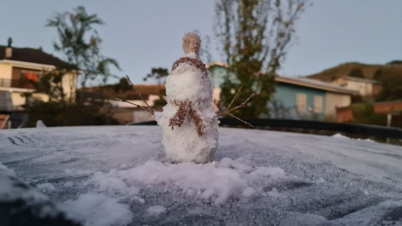 Com a quantidade de gelo que se formou, um fotógrafo e morador da região conseguiu construir até mesmo um “boneco de geada”. Para esta sexta-feira, as chances de geada, segundo a Epagri/Ciram, são grandes. Ao longo do dia, as temperaturas seguem amenas e podem passar dos 22ºC na região.