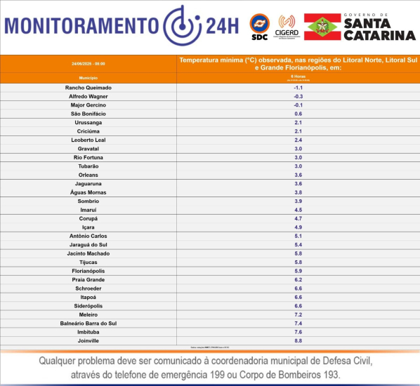 Na região, Gravatal e Tubarão foram as cidades que registraram as menores temperaturas na manhã de ontem, com 2,9°C e 3°C respectivamente. Jaguaruna e Orleans tiveram as mínimas em 3,6°C. Além delas, Imaruí registou mínima de 4,4°C e Imbituba, 7,5°C, segundo dados da Epagri/Ciram.