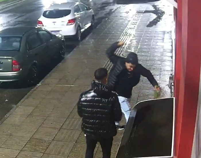 Além do telhado do abrigo, o homem também socou uma placa da loja, que amanheceu com marcas de sangue. A ação é flagrada no fim do vídeo.