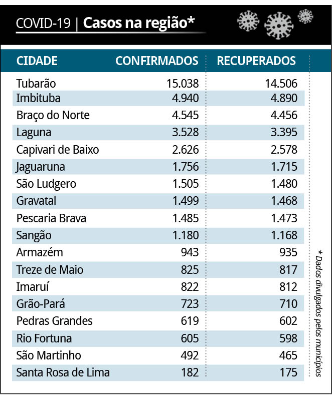 Com mais três mortes em Tubarão nas últimas 72 horas, a região chega a 493 óbitos por covid-19 desde o início da pandemia. A região somou, até ontem, 43.313 casos confirmados. Destes, 42.243 pacientes estão curados da doença.