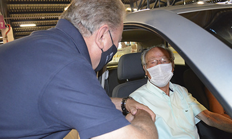 A primeira idosa a chegar no terceiro piso do estacionamento, onde foi montada toda a estrutura da Saúde, foi Carmen Mendes Stapazzoli, de 92 anos, que estava acompanhada por uma filha. Minutos depois, também no banco do caroneiro, chegava o padre Raimundo Ghizzoni, de 95 anos. Ele estava na praia de Itapirubá, onde permanece em isolamento social, e chegou animado para o procedimento. “É um momento importante”, disse o padre, que depois recebeu o adesivo com a mensagem: “Xô corona, agora estou protegido”, para exibir na camisa.