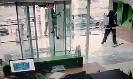 Com o machado, eles quebraram uma parede de vidro, mas fugiram sem levar nada após a segurança continuar atirando contra os bandidos.