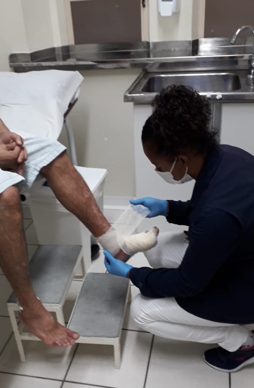 De acordo com ela, muitos pacientes, após o tratamento da doença, ainda retornam para casa com feridas graves necessitando de tratamento e acompanhamento prolongados para a cicatrização. “Então, no local realizamos a avaliação do paciente e da ferida para indicar as medidas necessárias de cuidado, sejam elas preventivas ou de tratamento, pois além das intervenções realizadas no ambulatório, o paciente precisa de todo cuidado e suporte em casa”, pontua.