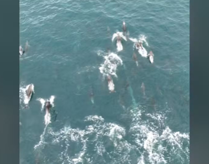 Durante o sábado, dezenas de golfinhos foram avistados nadando lado a lado na praia local