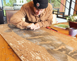 O artista explica que o processo criativo é guiado pela observação das linhas naturais, tanto da madeira quanto do mar. “Gravar é redescobrir as marcas que a vida deixa – nas superfícies, nas cores e na memória”, afirma, destacando a busca por captar a essência do movimento e da resistência presentes na natureza.