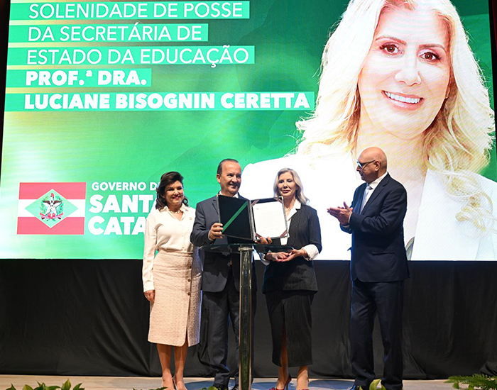O governador Jorginho Mello deu posse à professora Luciane Bisognin Ceretta como nova secretária de Estado da Educação na manhã de ontem. A nova secretária tem um extenso currículo na área da Educação, incluindo as funções de reitora da Universidade do Extremo Sul Catarinense (Unesc) e presidente da Associação das Fundações Educacionais Catarinenses (Acafe).