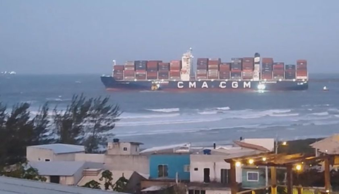Imagens que rodaram as redes sociais mostram o navio balançando com as fortes ondas e vento, enquanto rebocadores tentavam apoiar a embarcação.