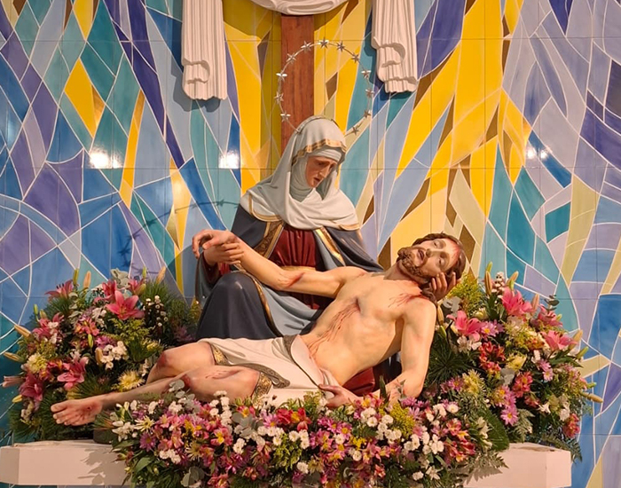 O título de Nossa Senhora da Piedade é referente a uma triste passagem da vida de Maria. A cena retratada na imagem trata-se do momento que Nossa Senhora recebe Jesus morto em seus braços, após a crucificação.