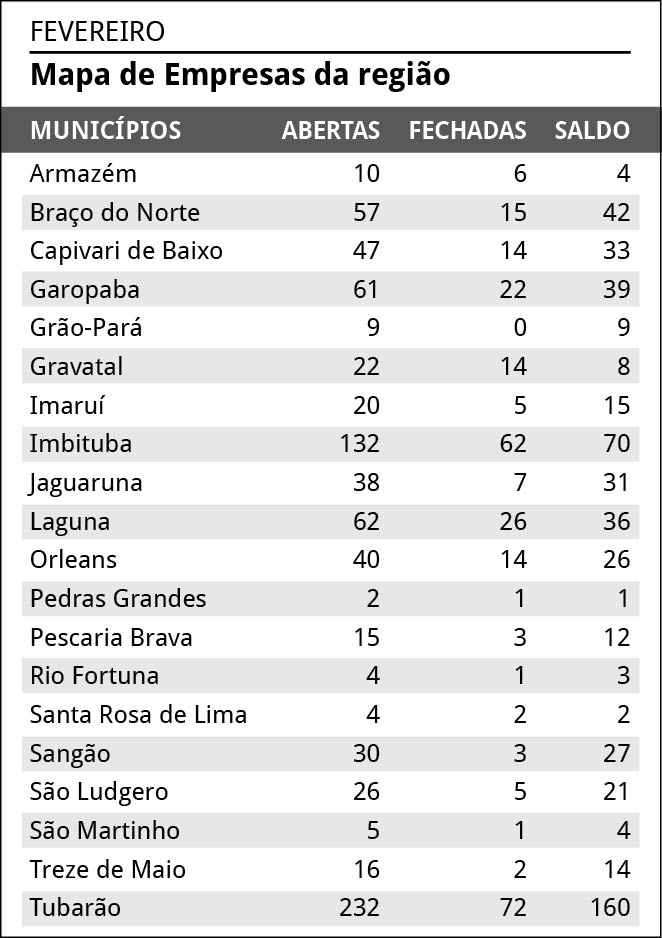 As cidades que tiveram maior número de abertura de novos empreendimentos na Amurel foram Tubarão (232), Imbituba (132) e Laguna (62). As três também registraram o maior número de fechamento de empresas durante o mês de fevereiro: 72, 62 e 26, respectivamente.