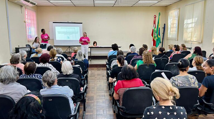 Grupos de idosas que participam do Serviço de Convivência e Fortalecimento de Vínculos (SCFV), cadastradas nos Centros de Referência de Assistência Social (Cras), assistiram na tarde de quinta-feira, no auditório da secretaria, à palestra ministrada pela enfermeira Cristiane Fernando e pela voluntária Eliane Fidelix, ambas da Rede Feminina de Combate ao Câncer de Tubarão.