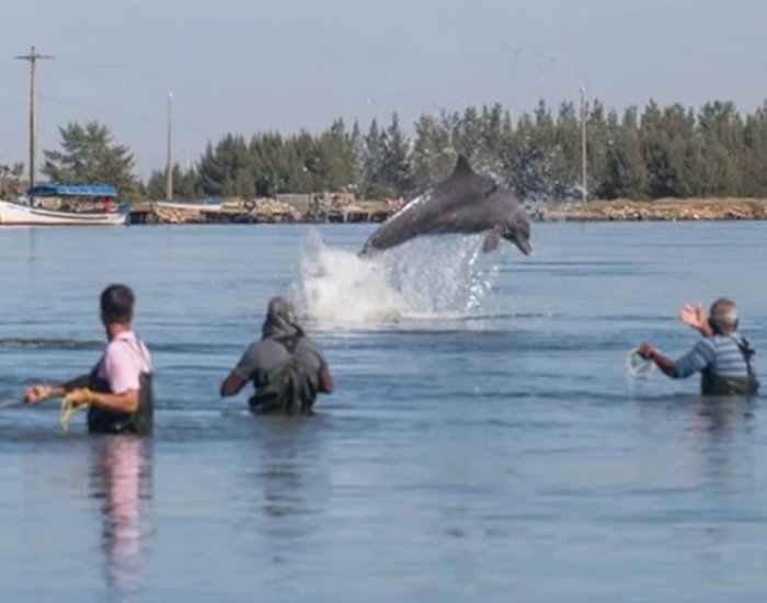 A pesca com botos é considerada um fenômeno raro no mundo. Nessa prática, os pescadores aguardam os sinais dos animais, que ajudam a conduzir cardumes de peixes para perto das redes. A relação de cooperação entre humanos e botos ocorre de forma natural e vem sendo mantida ao longo de gerações.