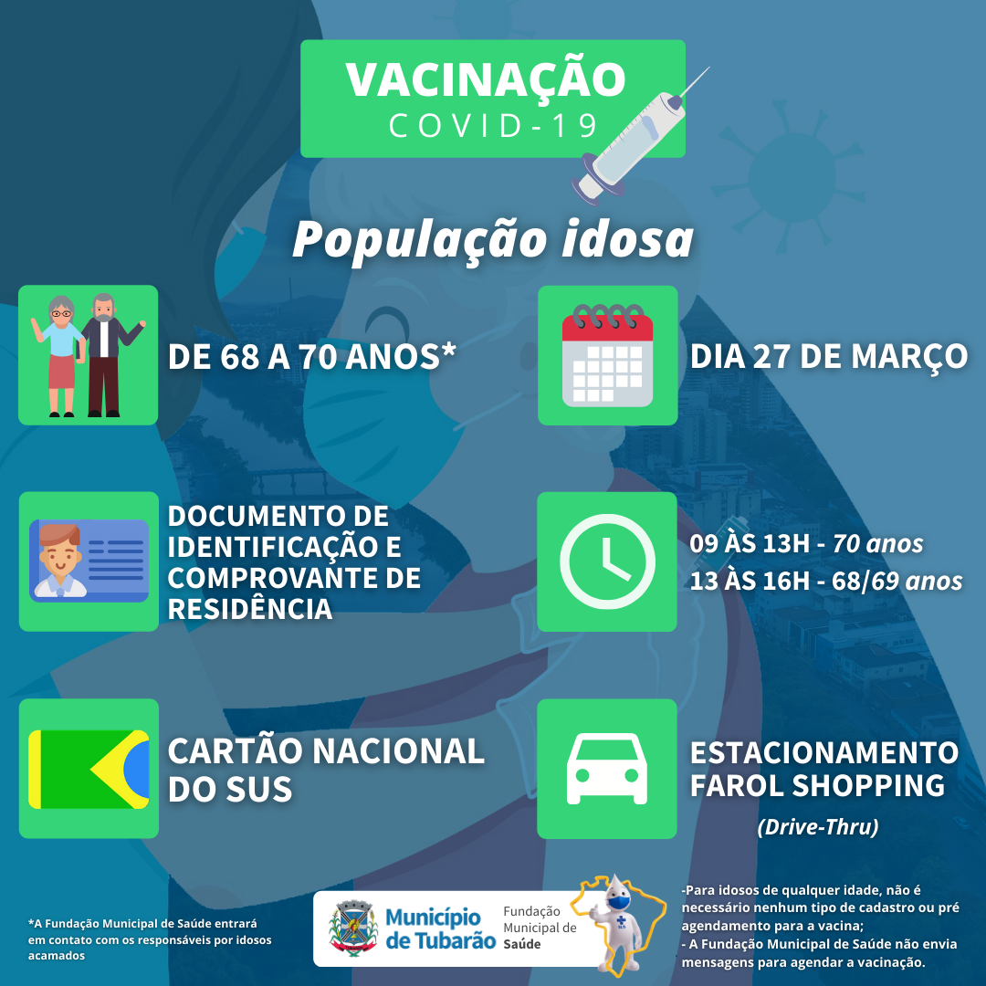 A Fundação Municipal de Saúde (FMS) de Tubarão vai realizar neste sábado a vacinação da primeira dose contra a covid-19 em pessoas com 68, 69 e 70 anos.