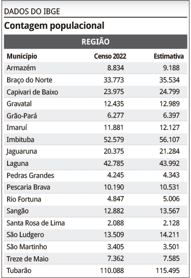 Na região, Tubarão, Braço do Norte e Imbituba foram os municípios com maior crescimento populacional estimado, segundo o IBGE. Na Cidade Azul, foram acrescidos mais 5.407 habitantes (aumento de 4,91%); Braço do Norte, 1.761 (5,2% a mais); e Imbituba, 3.528 (6,7% maior que em 2022).