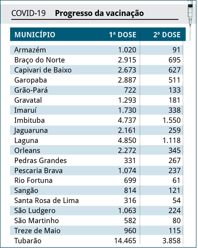 Os municípios que mais aplicaram as duas doses da vacina são Tubarão, Imbituba e Laguna, enquanto Santa Rosa de Lima aplicou 316 primeiras doses e 54 segundas doses até essa quarta.
