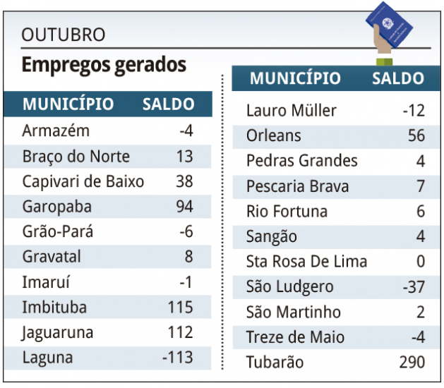 Em outubro, Tubarão, Imbituba e Jaguaruna registraram os maiores saldos positivos de admissões, com 290, 115 e 112 empregos novos, respectivamente.