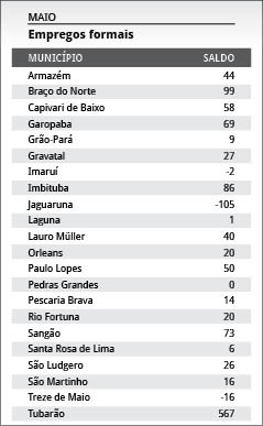 Tubarão foi o município que mais gerou empregos em maio, com saldo positivo de 567 novas vagas, sendo 292 no setor de serviços, 121 no comércio, 112 na indústria, 40 na construção civil e duas na agropecuária. Braço do Norte (99) e Imbituba (86) vêm em seguida e tiveram os maiores resultados
