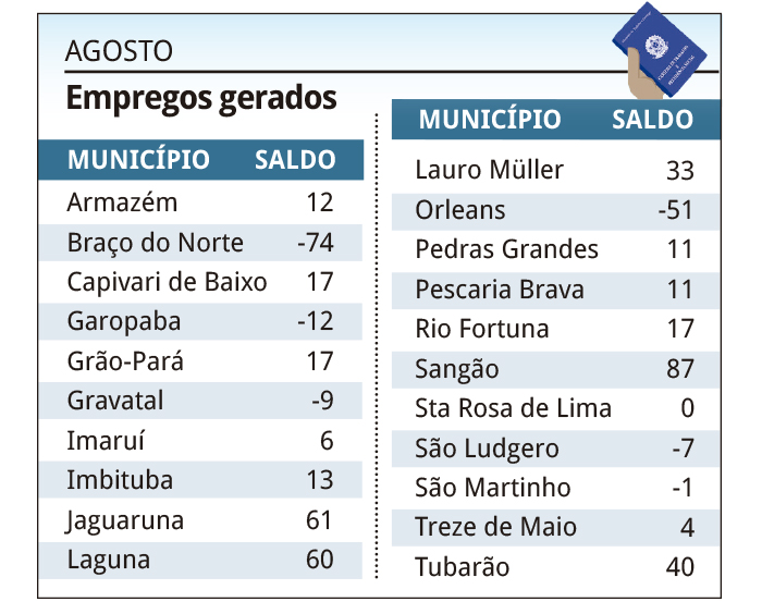 Das cidades da região, com base nos dados consultados, Sangão foi a que mais criou vagas com carteira assinada. Ao total, foram 324 admissões e 237 desligamentos, com um saldo positivo de 87 pessoas que permaneceram em seus empregos.