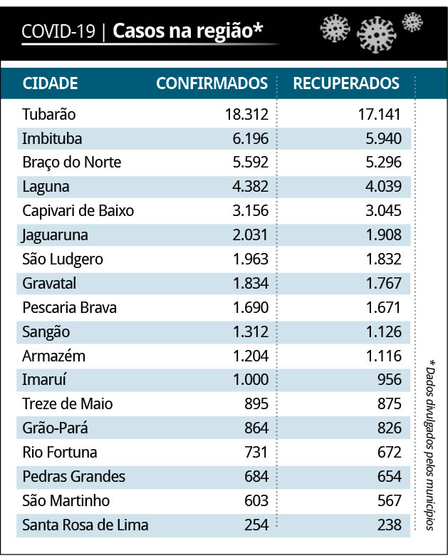 Até ontem, segundo informações fornecidas pelos municípios, a Amurel contabilizava 670 mortes em decorrência de complicações causadas pela covid-19 desde o início da pandemia. Foram 15 a mais, segundo os municípios. Em Tubarão, foram sete nas últimas 72 horas. O total nos municípios são: Tubarão (265), Laguna (82), Imbituba (69), Braço do Norte (57), Capivari de Baixo (39), Jaguaruna (34), Gravatal (26), São Ludgero (16), Imaruí (12), Pedras Grandes (12), Pescaria Brava (11), Armazém (11), Sangão (8), Grão-Pará (6), Rio Fortuna (6), Treze de Maio (6), São Martinho (5) e Santa Rosa de Lima (5).