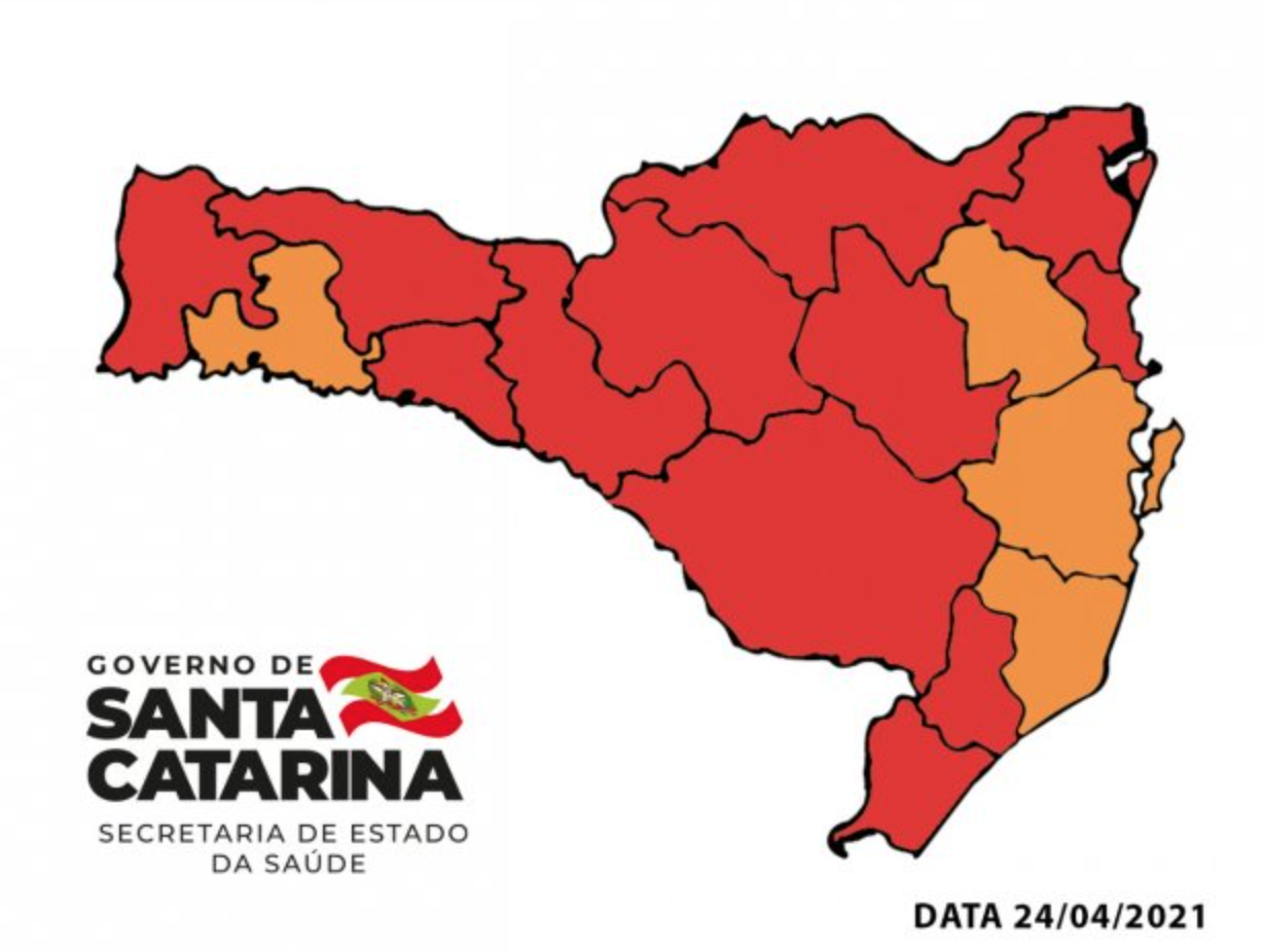 As regiões de Laguna, da Grande Florianópolis, Médio Vale do Itajaí e Oeste foram reclassificados para o nível grave (cor laranja). A última matriz, divulgada no dia 17, apontava todas as regiões com risco gravíssimo (cor vermelha).