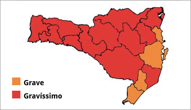 No último boletim, divulgado em 3 de abril, apenas a região de Xanxerê encontrava-se no nível grave, as demais estavam em estado gravíssimo. No levantamento desta semana, o local volta ao patamar mais alto, enquanto as regiões Carbonífera, Extremo-Sul Catarinense, Foz do Rio Itajaí e Grande Florianópolis foram reclassificadas para o nível grave.