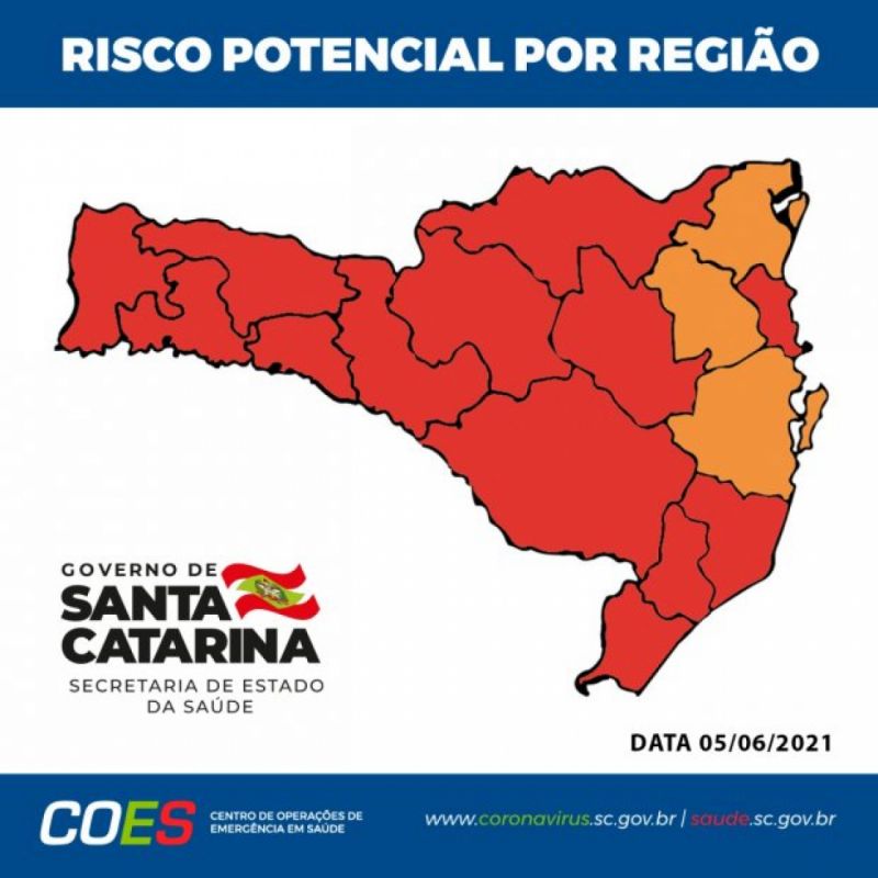 A Secretaria de Estado da Saúde (SES) divulgou neste sábado, 5, a Matriz de Risco Potencial e indicou melhora da semana passada para esta. Além da região da Grande Florianópolis, que se manteve no patamar grave (cor laranja), a região Nordeste e a do Médio Vale do Itajaí também melhoraram índices e saíram da situação gravíssima (cor vermelha) para a grave. As demais 13 regiões de saúde permanecem no nível gravíssimo para transmissão da covid-19.