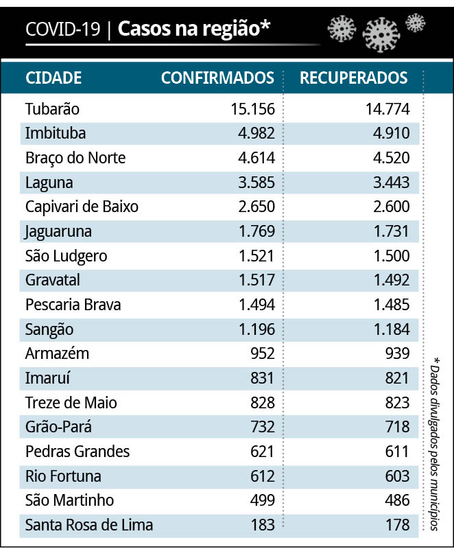 A região somou, até este fim de semana, 43.742 casos confirmados de coronavírus desde o início da pandemia, em março do ano passado. Destes, 42.818 pacientes já estão curados e 498 moradores da Amurel morreram em decorrência de complicações causadas pela covid-19, segundo dados fornecidos pelos municípios. Até ontem, 426 pessoas ainda estavam com a doença ativa.