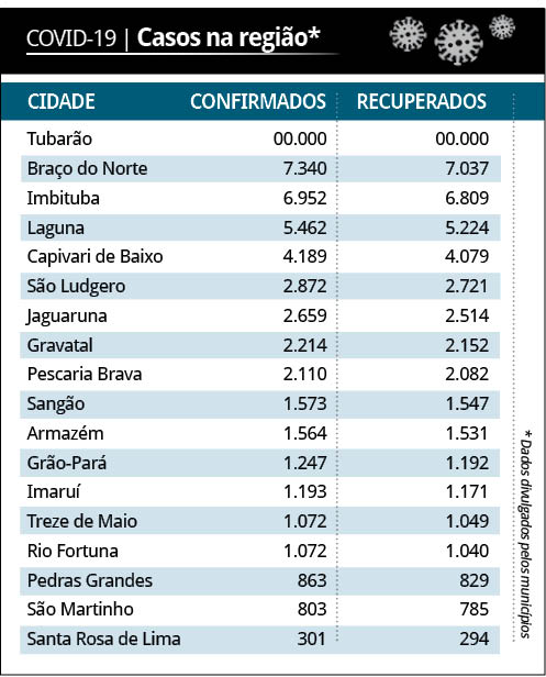 Ao todo, desde o início da pandemia, foram registrados 1.093 óbitos na região: Tubarão (403), Laguna (130), Imbituba (101), Braço do Norte (96), Capivari de Baixo (66), Gravatal (53), Jaguaruna (51), São Ludgero (35), Armazém (29), Pedras Grandes (22), Pescaria Brava (21), Imaruí (20), São Martinho (15), Sangão (13), Rio Fortuna (12), Grão-Pará (10), Treze de Maio (10) e Santa Rosa de Lima (6).