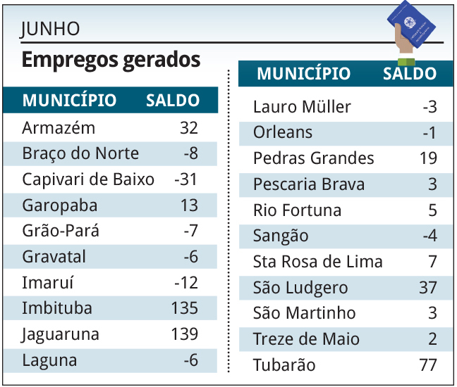 Entre os municípios que mais criaram oportunidades de trabalho, destaque para Jaguaruna, com 139 admissões a mais que desligamentos; Imbituba, com 135; e Tubarão, com 77 novos postos.
