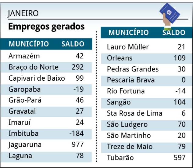 Em janeiro, Jaguaruna, Tubarão e Braço do Norte foram os municípios que registraram os maiores saldos positivos de admissões, com 977, 597 e 292 empregos novos, respectivamente.