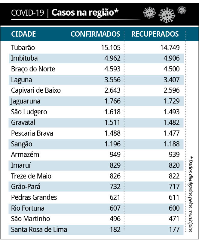 A região registrou nessa quinta-feira mais três óbitos em decorrência de complicações causadas pelo coronavírus. Um homem de 57 anos foi a vítima em Imbituba, e duas mulheres, de 71 e 77 anos de idade, foram as mortes em Braço do Norte. Com isso, a Amurel soma agora 496 óbitos desde o início da pandemia.