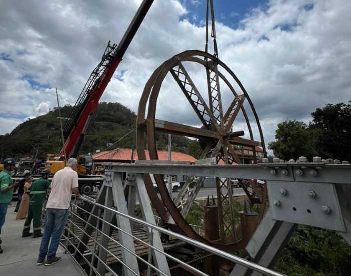 A estrutura foi construída inteiramente com aço reaproveitado da Ponte Hercílio Luz, um dos principais símbolos históricos de Santa Catarina. Para o prefeito Agnaldo Filippi, o novo equipamento representa uma homenagem direta à indústria do passado, especialmente aos moinhos e atafonas que marcaram a história da região. “Hoje nós estamos aqui no Centro da nossa cidade para mais um dia importante: estamos alocando aqui a nossa roda d’água, construída inteiramente com aço da Ponte Hercílio Luz”, afirmou o prefeito durante a instalação.