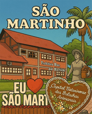 O conteúdo apresenta ícones como o Portal de Entrada, a Praça Central, as casas enxaimel, a Paróquia São Sebastião, o Santuário Beata Albertina e o Brasão do Município, além de referências à gastronomia típica, como as tradicionais bolachas artesanais.