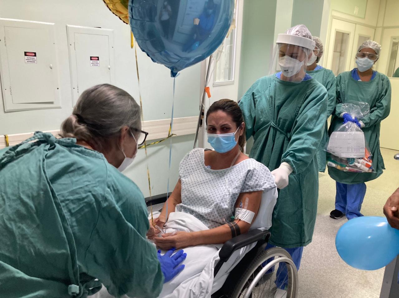 O mesmo aconteceu Marina Pansera Figueiredo, 39 anos, também de Tubarão. Ela entrou no HNSC no dia 12 de março e dois dias depois precisou de ventilação mecânica. Marina foi intubada ainda na enfermaria, sendo que dia 18 conseguiu leito, sendo transferida para Unidade de Terapia Intensiva. Na sua alta recebeu o carinho da equipe assistencial, assim como da mãe Dirce Pansera e a madrasta Tatiane Coan.