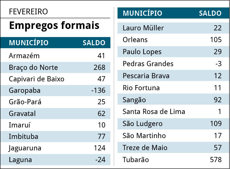 O setor de serviços foi o que mais gerou empregos em fevereiro, com 714 admissões a mais que desligamentos. Tubarão foi o município que mais gerou emprego nesta área, com saldo positivo de 300 novas vagas. Braço do Norte (126) e Jaguaruna (102) vêm em seguida. Eles também foram os municípios que tiveram os maiores resultados positivos de forma geral.