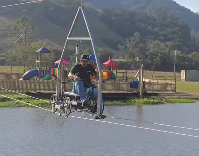 O veículo funciona suspenso por cabos de aço e percorre, de forma horizontal, o lago do parque. A propulsão é feita pelo próprio usuário, por meio de pedaladas, o que transforma a experiência em uma mistura de diversão e atividade física.