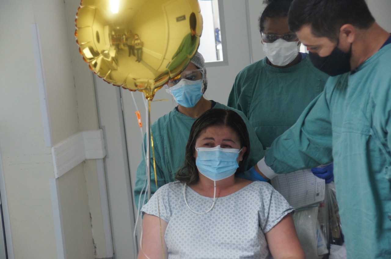 Outra paciente que deixou a UTI foi Gisele Farias de Medeiros, 37 anos, que ficou 13 dias na terapia intensiva, precisando de ventilação mecânica. Antes da alta, ela já tinha recebido visitas virtuais da sogra, sogro e a filha, em encontros emocionantes, cheios de palavras de carinho e força. “Nunca perdemos a fé. Foram muitas orações todos os dias”, diz o esposo Jean Pierri, que veio receber Gisele na porta da UTI.