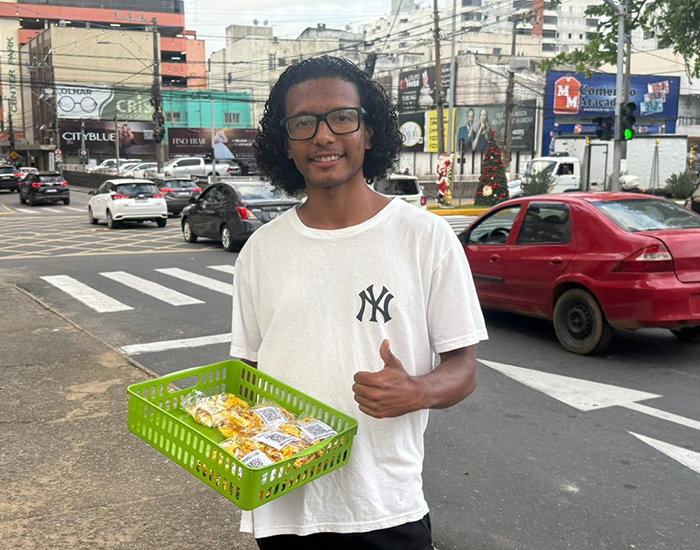 Wesley vende paçocas no trânsito, atividade que se tornou sua principal fonte de renda. O dinheiro arrecadado é direcionado para o pagamento da graduação em Nutrição e para contribuir com as despesas da casa.