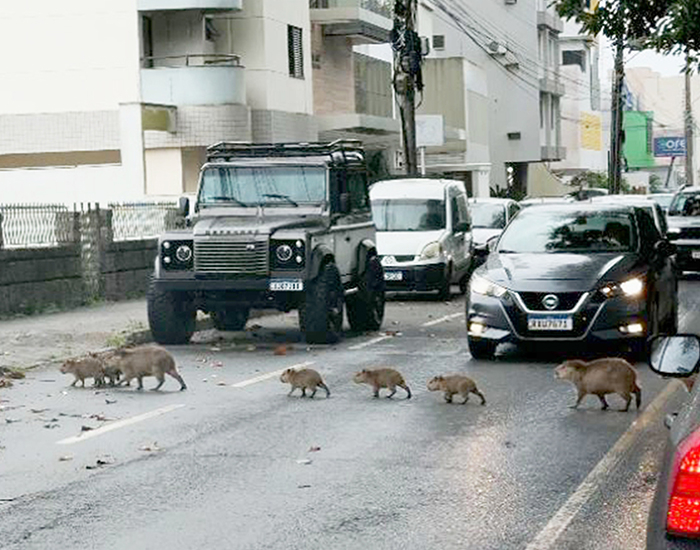 No vídeo, as capivaras aparecem caminhando em fila, de forma organizada, lembrando uma “família”, enquanto os motoristas reduzem a velocidade para que a travessia seja tranquila.