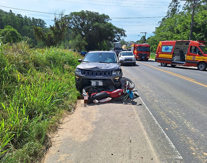 Um acidente envolvendo um Jeep Compass e uma moto deixou um motociclista de 58 anos gravemente ferido na tarde desta quinta-feira, em Braço do Norte. A colisão ocorreu por volta das 14h45, na SC-370.
