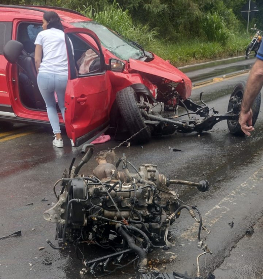 A colisão envolveu um HB20 e um VW Saveiro. Com o forte impacto, os veículos ficaram completamente destruídos, com peças espalhadas pela rodovia.