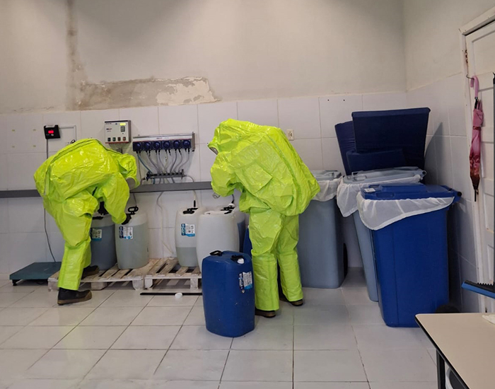 Os bombeiros isolaram o local, utilizaram equipamentos de proteção e aplicaram um agente neutralizante para conter o vazamento e eliminar os vapores. Após a ventilação e a confirmação de que o ambiente estava seguro, a área permaneceu isolada para limpeza e destinação adequada dos resíduos pela empresa responsável.