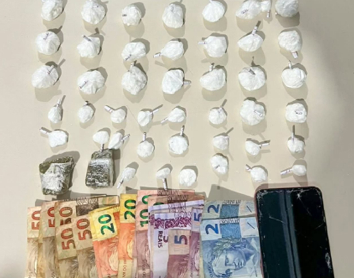 Diante da situação, os agentes fizeram uma busca detalhada, encontrando também R$ 491 em notas miúdas, valor compatível com a comercialização de entorpecentes.