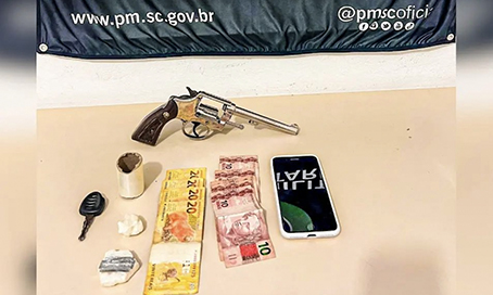 A Polícia Militar recebeu informações de que o suspeito estava circulando em um Prisma pelo bairro Oficinas e, após rondas, conseguiu localizá-lo. Em busca veicular, os agentes encontraram no assoalho do veículo, no lado do carona, um revólver calibre 38, uma quantia em dinheiro e 11 gramas de crack.