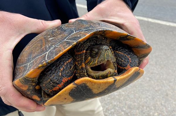 Resgatado sem ferimentos, o cágado foi devolvido à natureza, longe da rodovia. Este animal, da espécie tigre d’água, é geralmente criado em aquários caseiros quando filhote e pode ter sido abandonado depois de crescer.